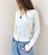 チクチクしない生地感で着心地が良く、腰回りがカバーできる丈感なのも嬉しいポイント。 フロントのパールボタンを閉めてトップスのように着用することもできます。 首元がV開きなのでスッキリとした印象に。